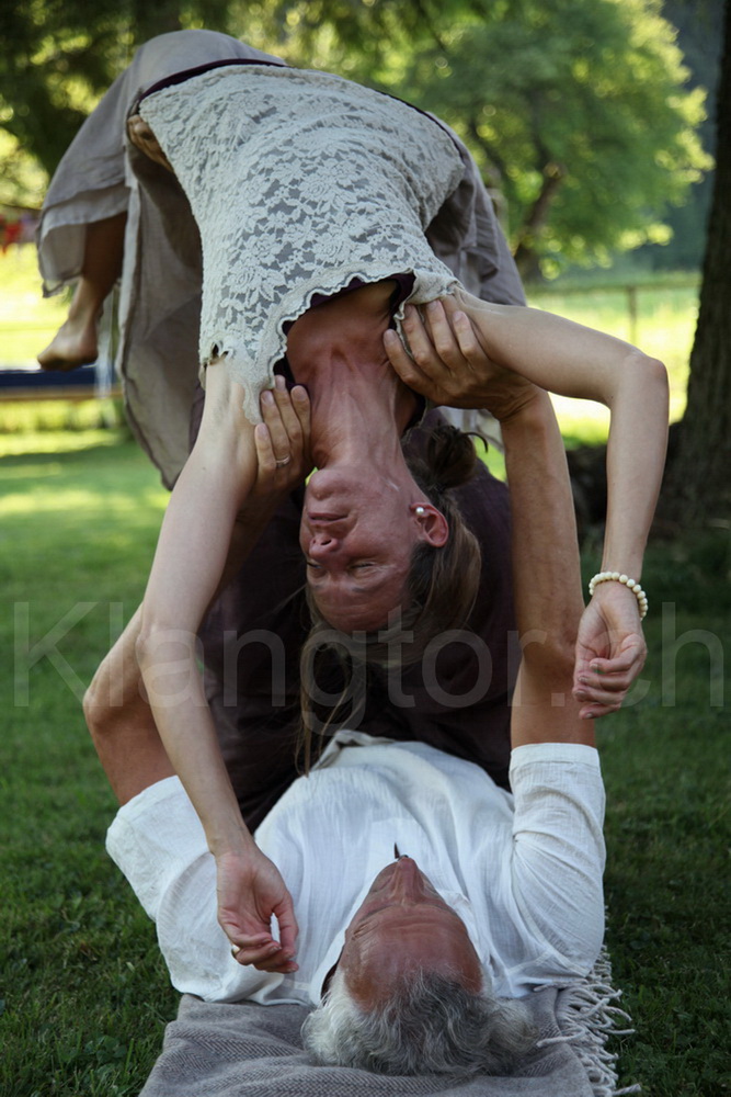 Durch das kopfüber Hängen während der Massage wird die Wirbelsäule